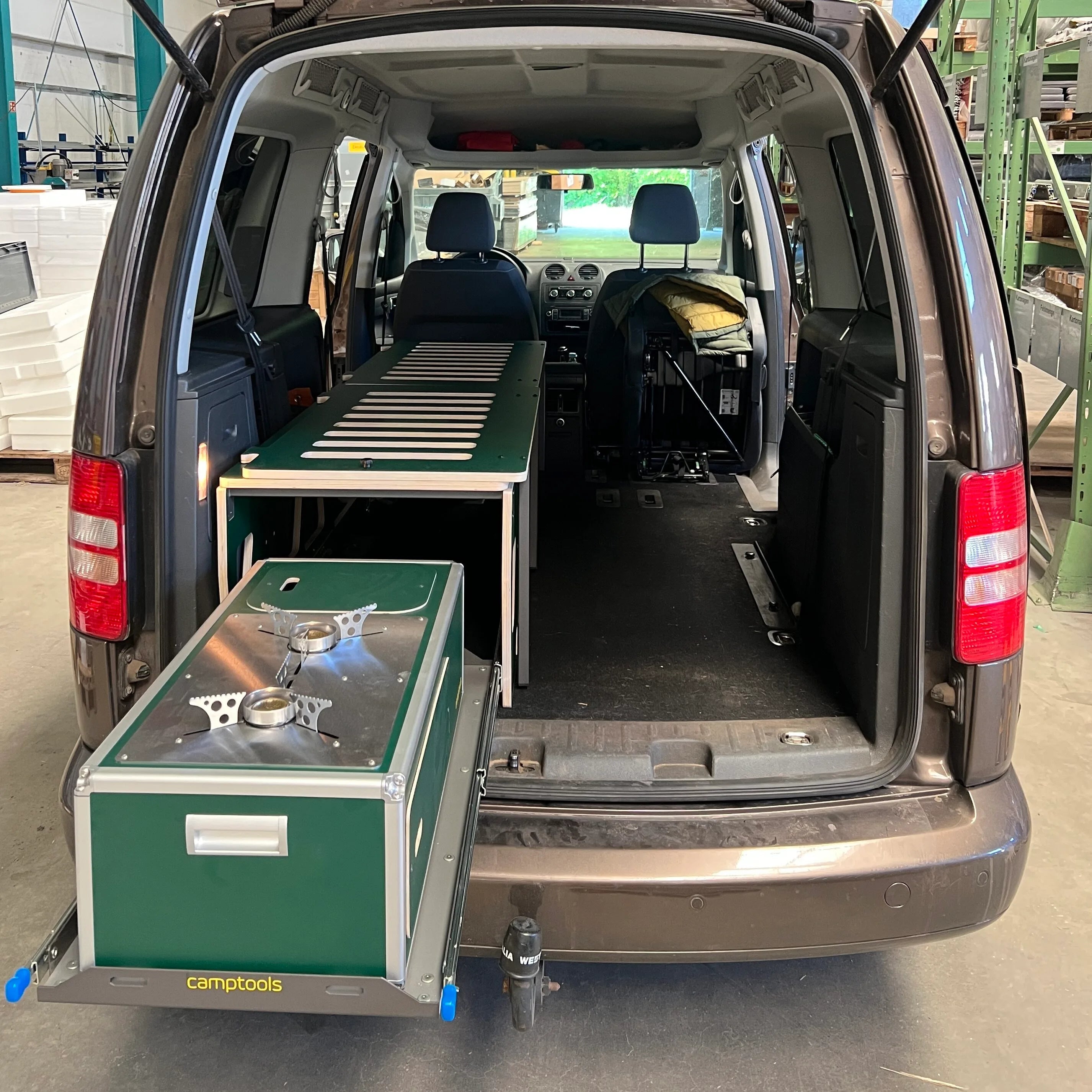 Die COBO Küchenbox kann natürlich auch auf dem separaten Heckauszug platziert werden. Die Kühlboxverkleidung ist zu schmal für den breiteren Auszug. Grundsätzlich sieht das Komplettset des COSLEEs nicht so schön aus beim HIGHLINE!