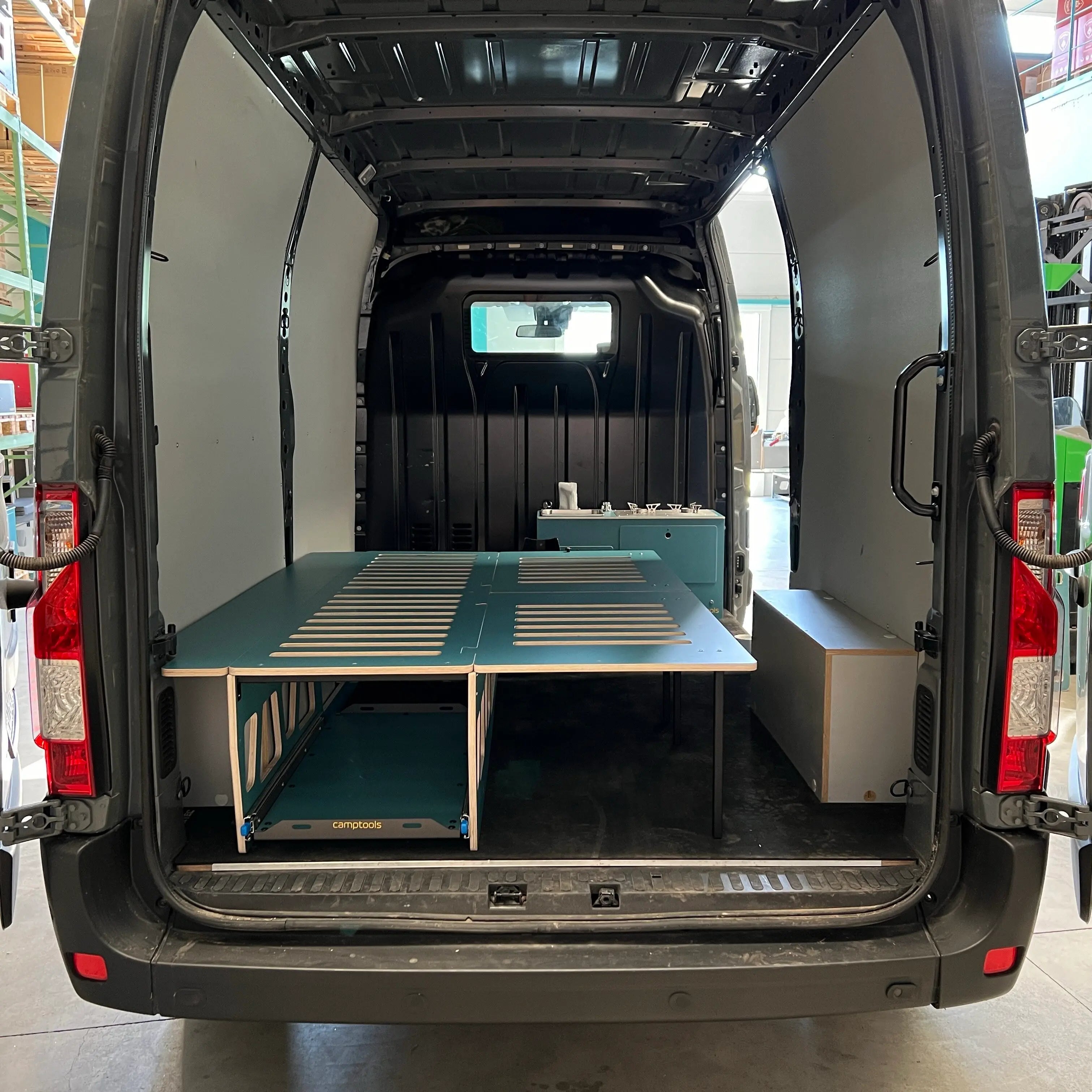 • Doppelbett: Vollwertige 2-Personen-Liegefläche in Van-Breite – mit stabiler, formschlüssiger Auflage.