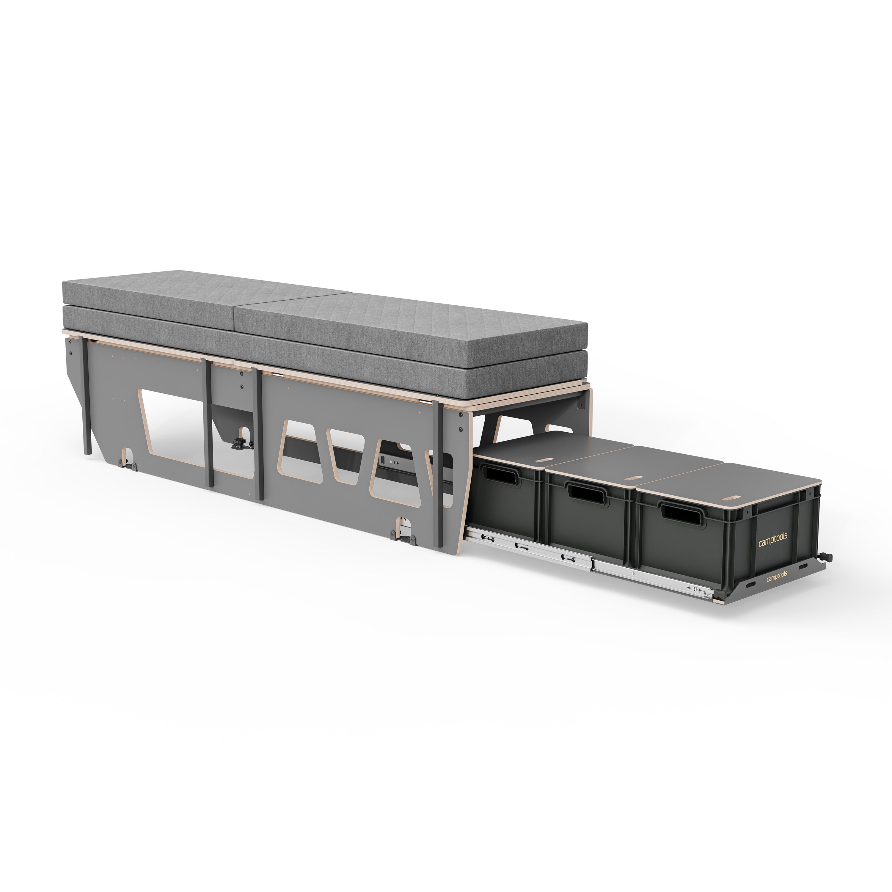 Nein. Das Schlafsystem wird einfach über die werkseitig vorhandenen Bodenschienen/Sitzschienen fixiert. Keine Bohrungen oder Umbauten nötig – das Fahrzeug bleibt unverändert. Das benötigte Befestigungsmaterial ist im Lieferumfang enthalten.